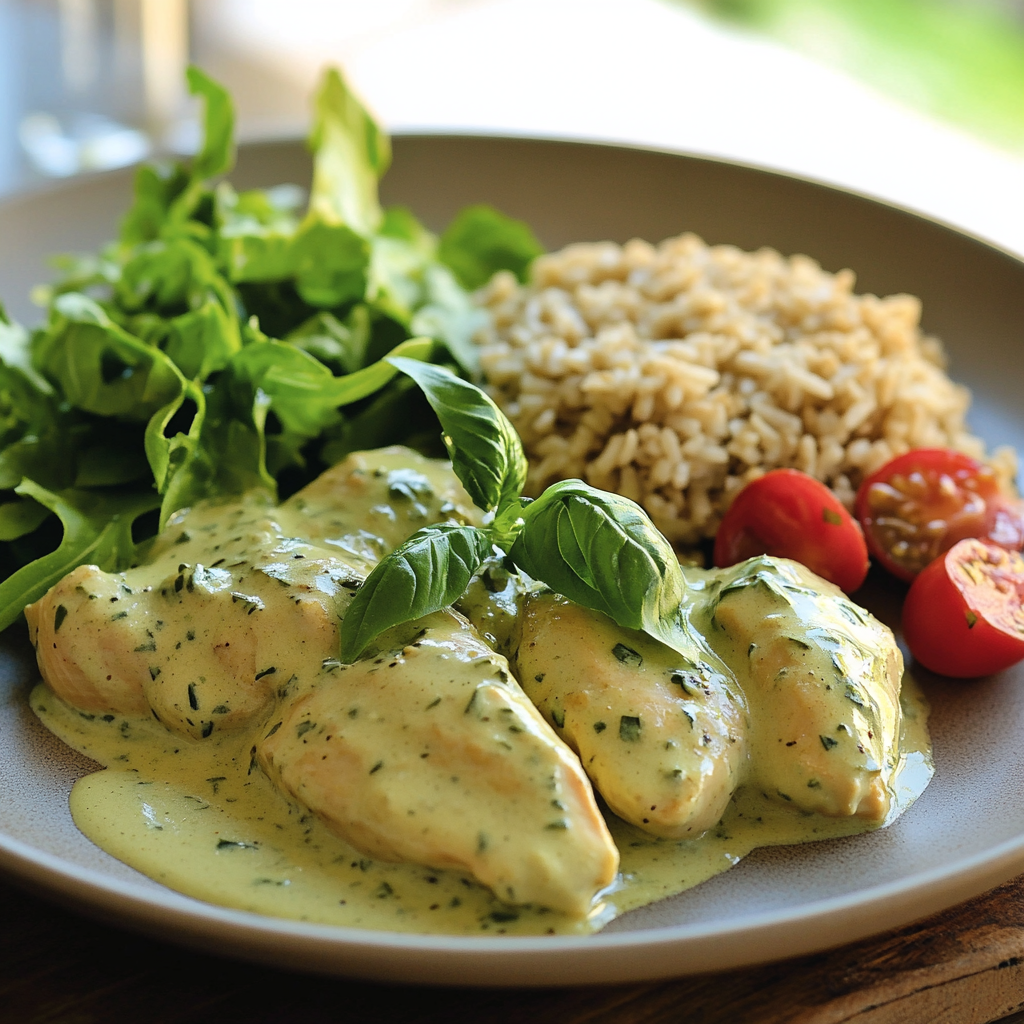 Rjómalagður og mjúkur kjúklingur borinn fram með hýðishrísgjrónum og salati